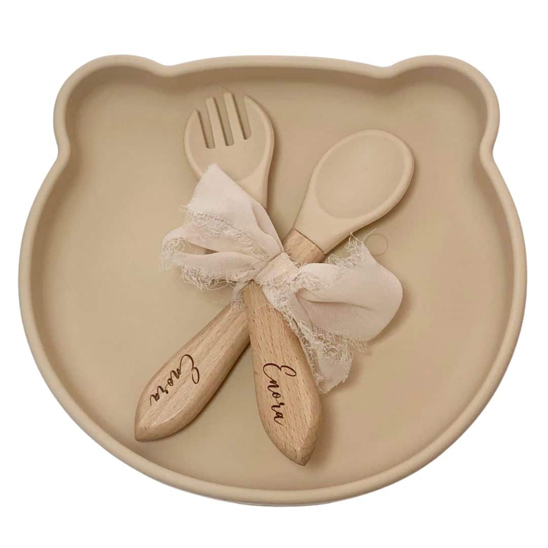 Il comprend une assiette en silicone en forme d’ours, des couverts en bois et silicone gravés au prénom, et une plaque en bois personnalisée que les parents pourront réutiliser comme décoration dans la chambre du petit bout.