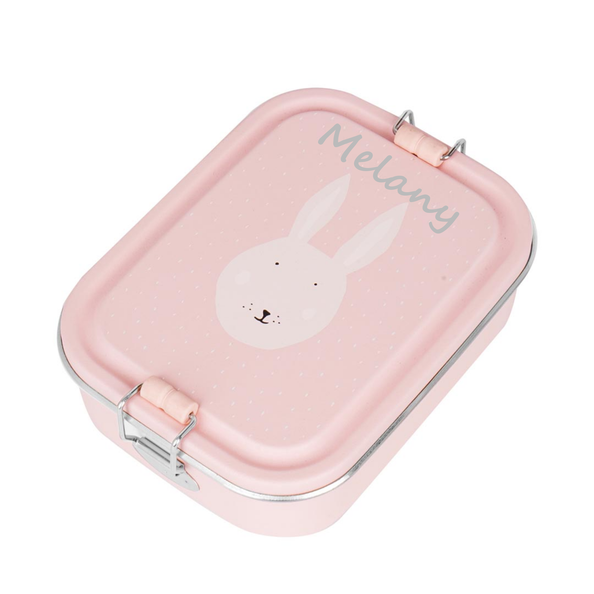 La lunch box Lapin peut être personnalisée avec le prénom de l’enfant, grâce à une gravure soignée directement sur la boîte.