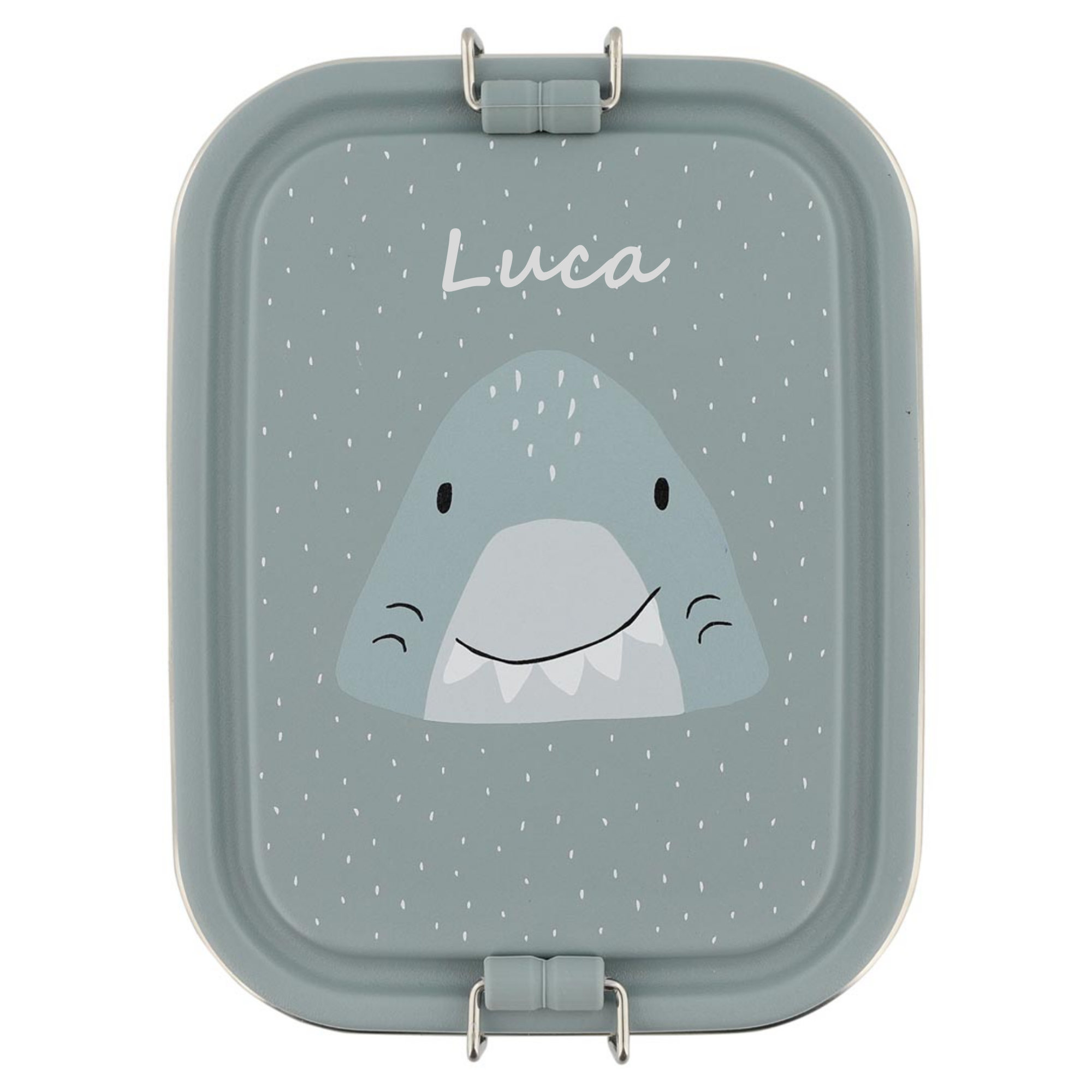 La lunch box Requin peut être personnalisée avec le prénom de l’enfant, grâce à une gravure soignée directement sur la boîte.