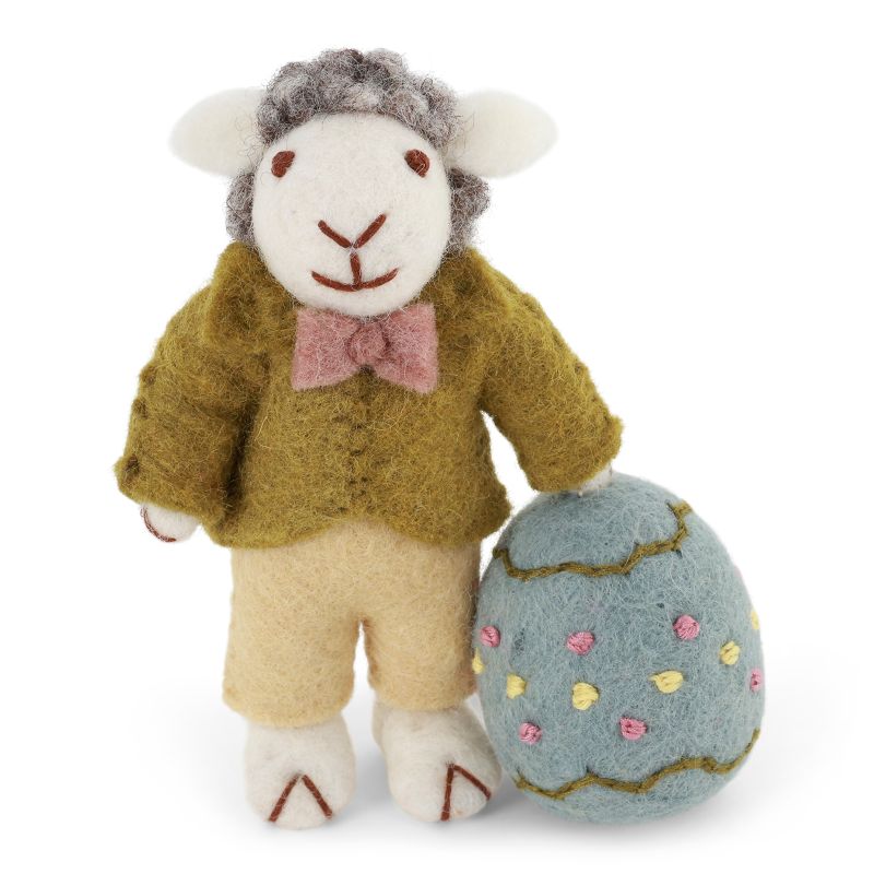 Ce mouton de Pâques Gry & Sif incarne toute la douceur et la poésie des fêtes printanières. Habillé d’un costume vert raffiné, rehaussé d’un nœud papillon, il tient délicatement un œuf de Pâques bleu, symbole de renouveau et de joie.