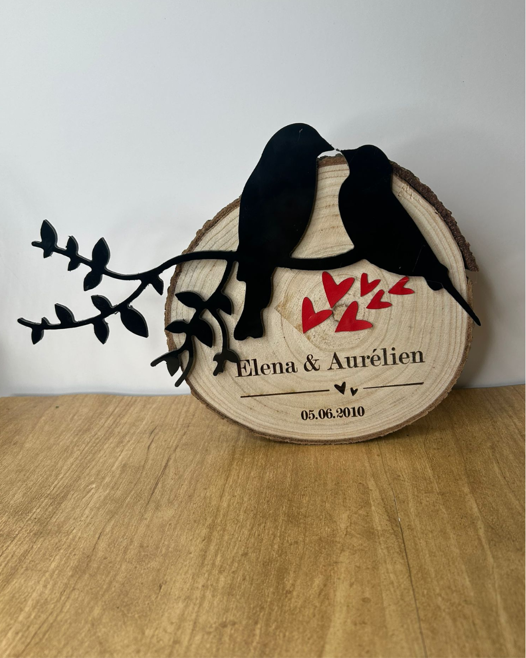 Les prénoms des amoureux sont gravés directement dans le bois, accompagnés de la date de votre choix : rencontre, fiançailles, mariage ou tout autre moment important. Chaque pièce devient ainsi unique et raconte votre histoire.