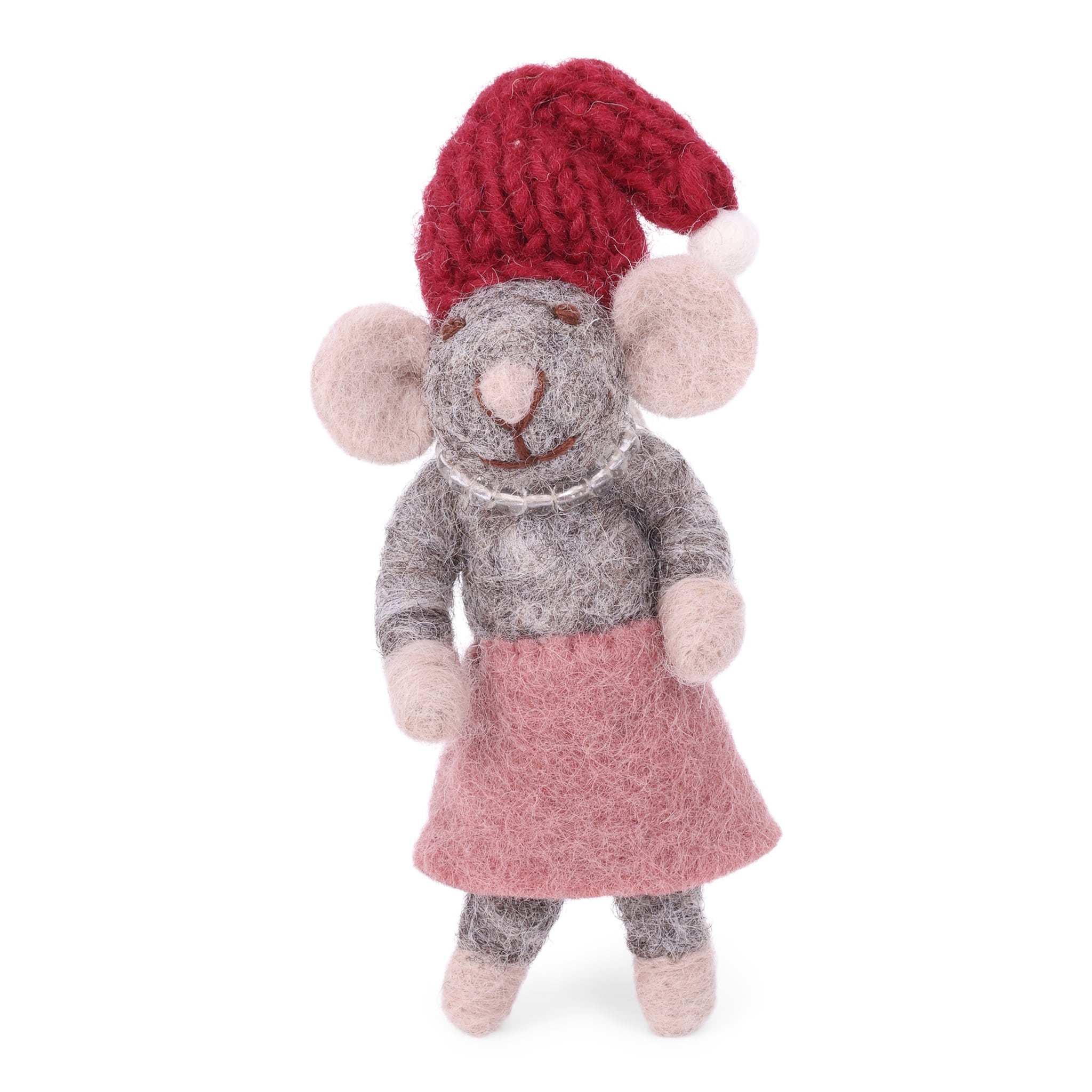 Souris Gry and Sif avec sa jupe rose, son bonnet rouge et son petit collier de perles est une décoration en laine feutrée entièrement fabriquée à la main. Elle apporte instantanément une touche douce, poétique et festive à votre intérieur. Cette petite souris au look raffiné incarne parfaitement l’univers scandinave de la marque : simple, mignonne et artisanale.
